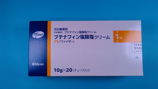 ブテナフィン塩酸塩は無臭の白色結晶で、メタノール、エタノールおよびクロロホルムによく溶け、水には僅かに溶ける。